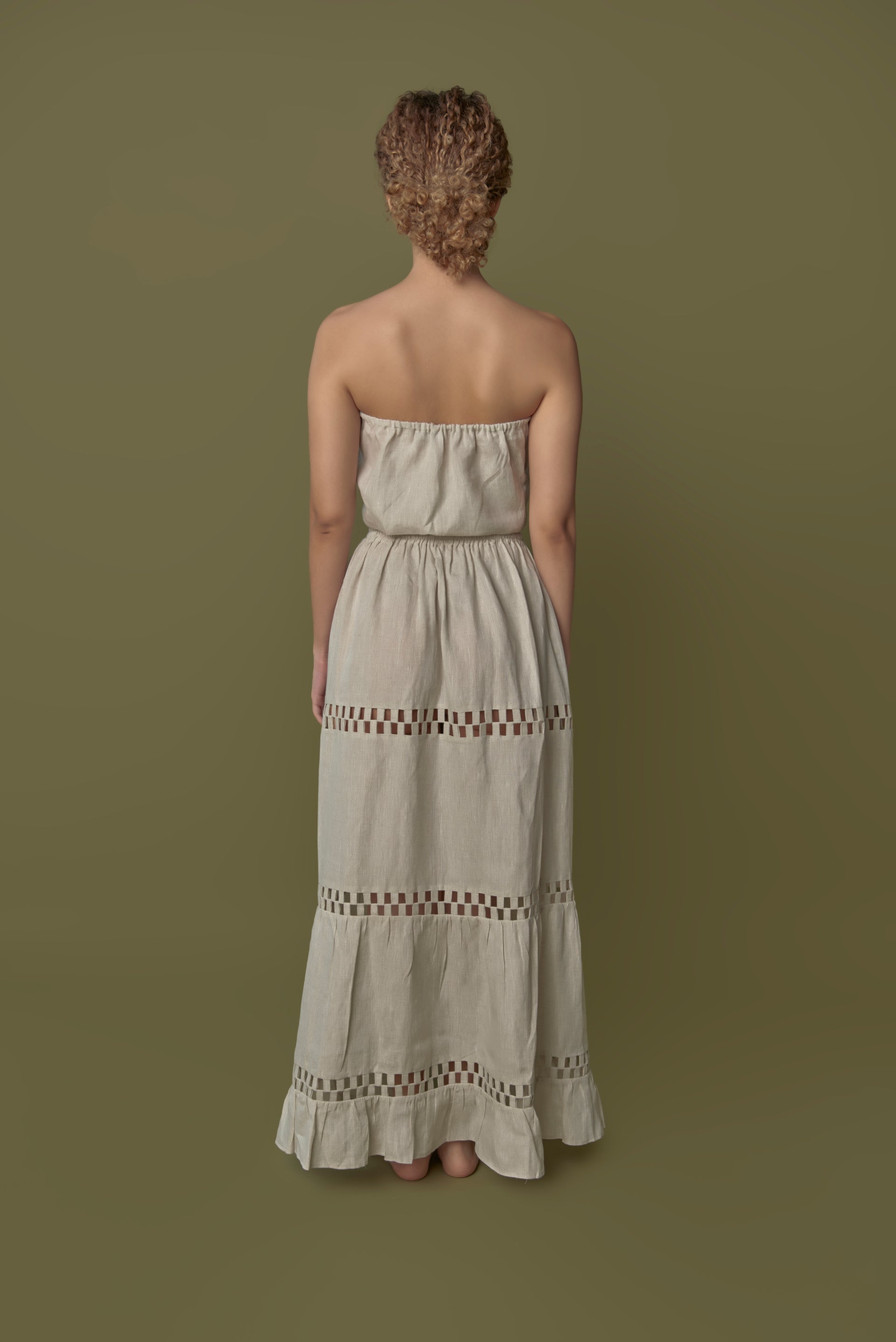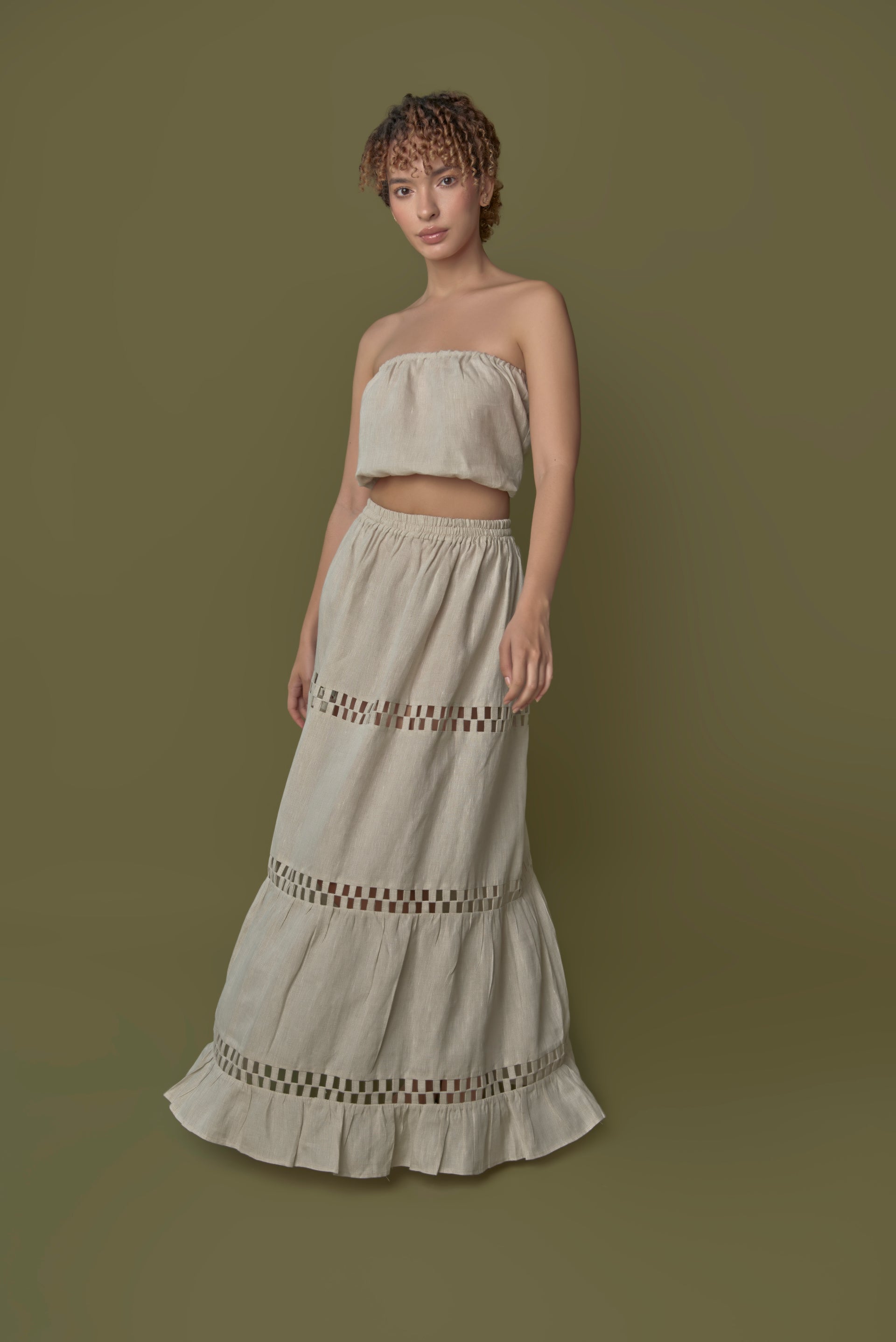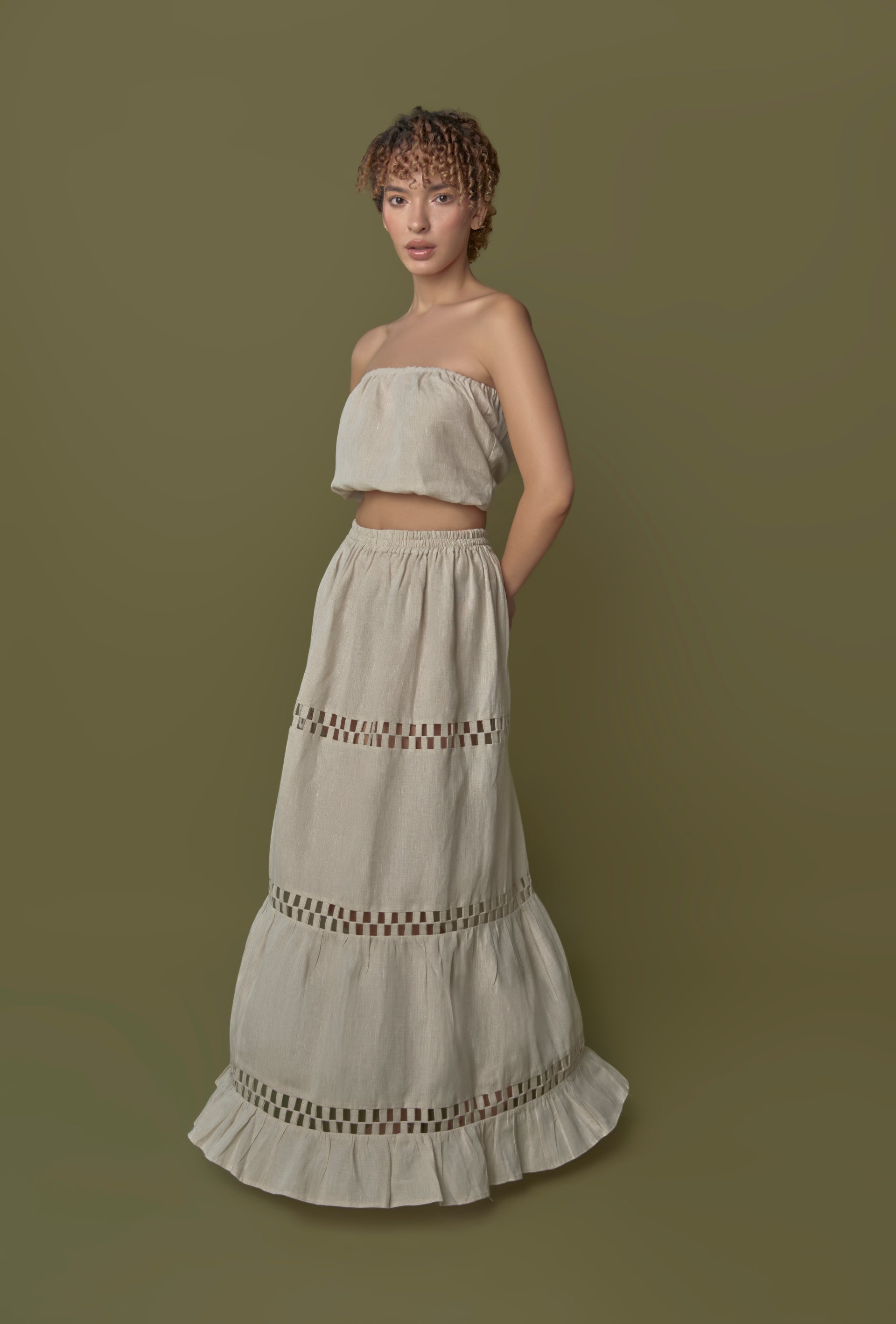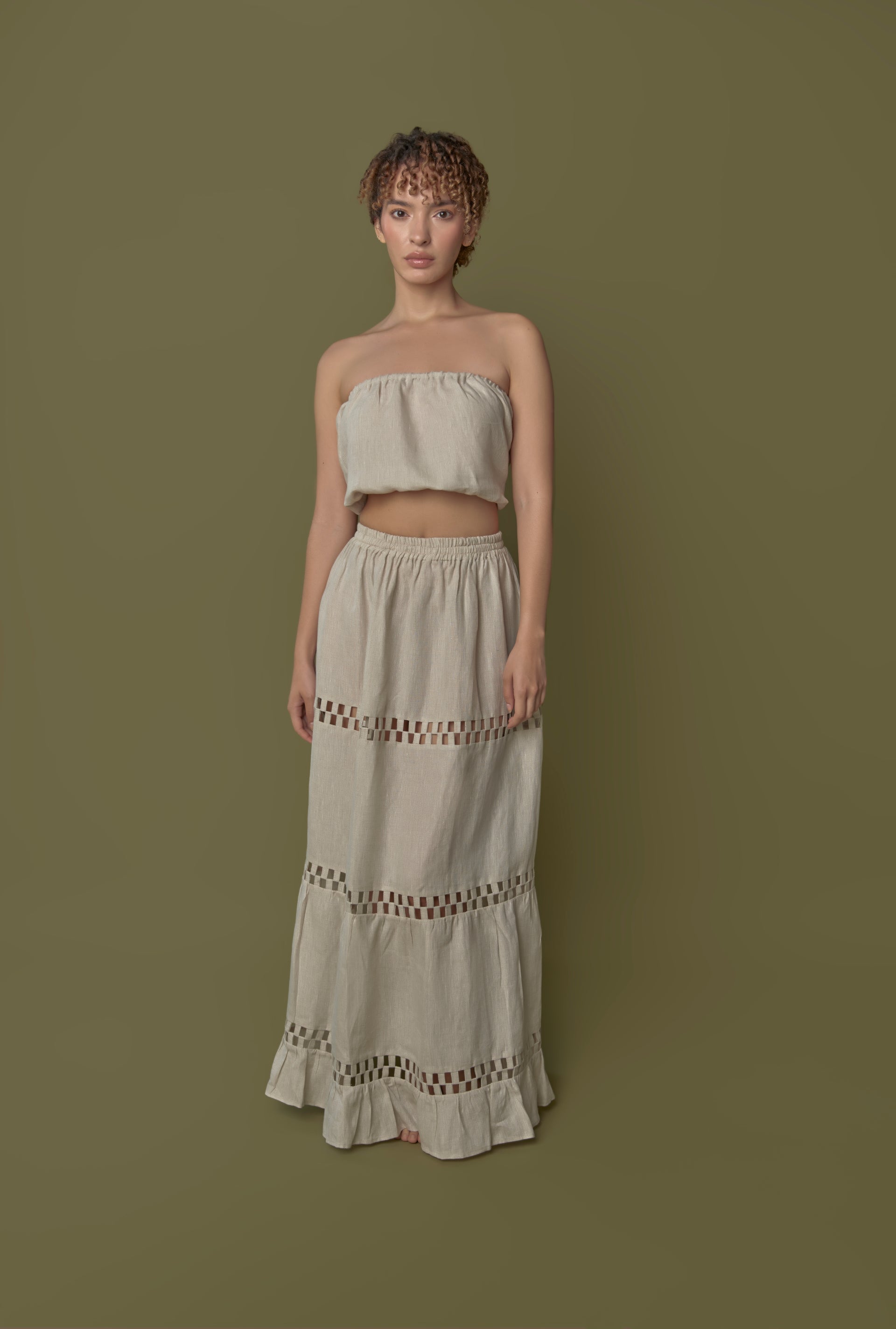 Top de lino con escote fruncido y elástico tanto en el busto como en el dobladillo, creando un efecto delicadamente abullonado. Su diseño sencillo y versátil resalta la naturalidad del tejido, adaptándose con suavidad al cuerpo y ofreciendo una silueta fresca y femenina.